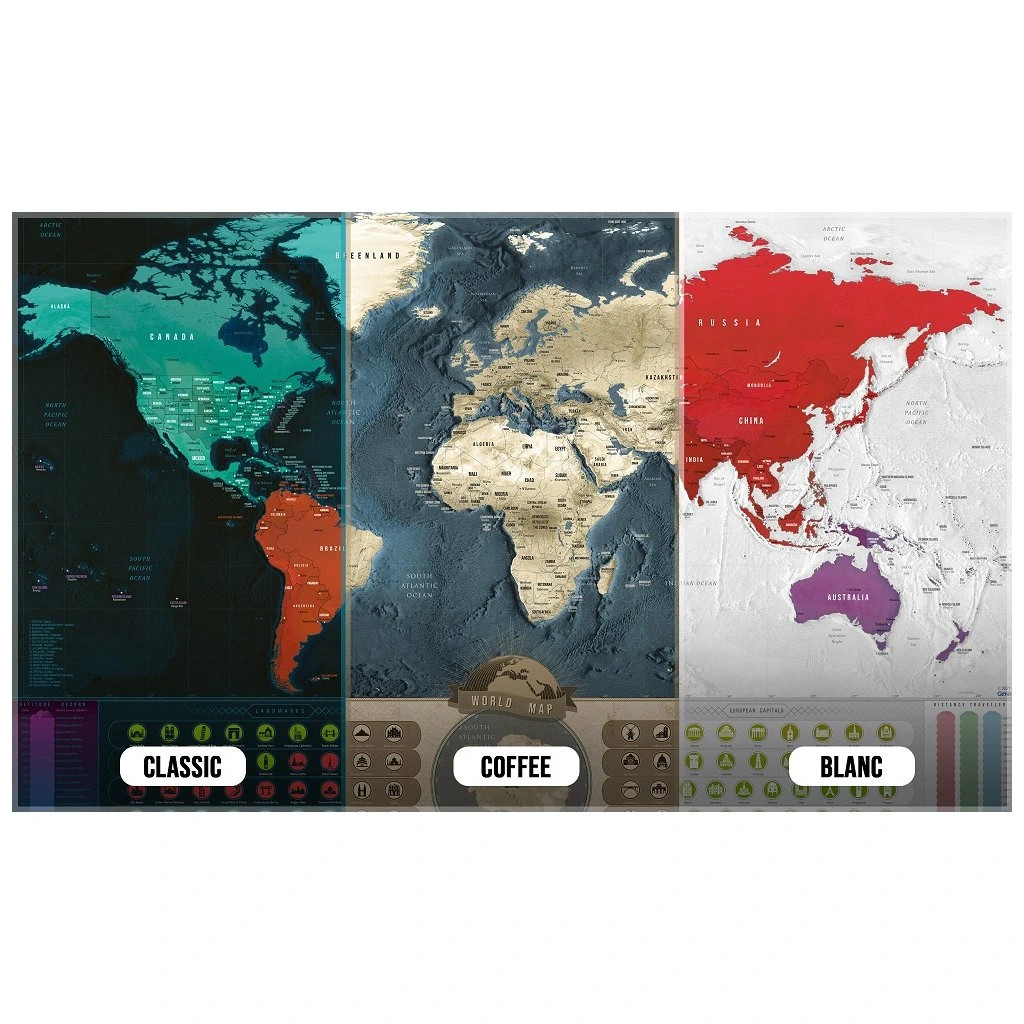 masszív védőhengerbe csomagolva a sérülések elkerülése érdekében. A térkép alján a világ nevezetességei kontinensek szerint, színkódolva találhatók meg a könnyebb beazonosítás érdekében.
