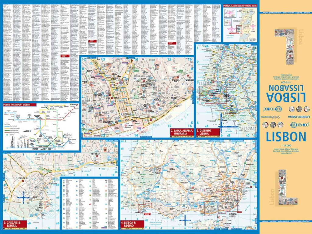 Our soft-laminated folded map of Lissabon in the 8th edition shows: Lisbon 1:14 000, Baixa, Alfama, Mouraria 1:8 250, Cascais & Estoril 1:12 500, Lisbon & Region 1:135 000, Lisbon District 1:700 000, Portugal administrative & time zones, Public Transport Lisbon and Top 30 sights. Borch Maps show hotels, museums, monuments, markets, public transport, top sights and points of interest, useful statistics, conversion charts for temperatures, weights and measurements, climate charts showing temperatures, sunshine hours, precipitation and humidity, overview maps, time zones, and much more...