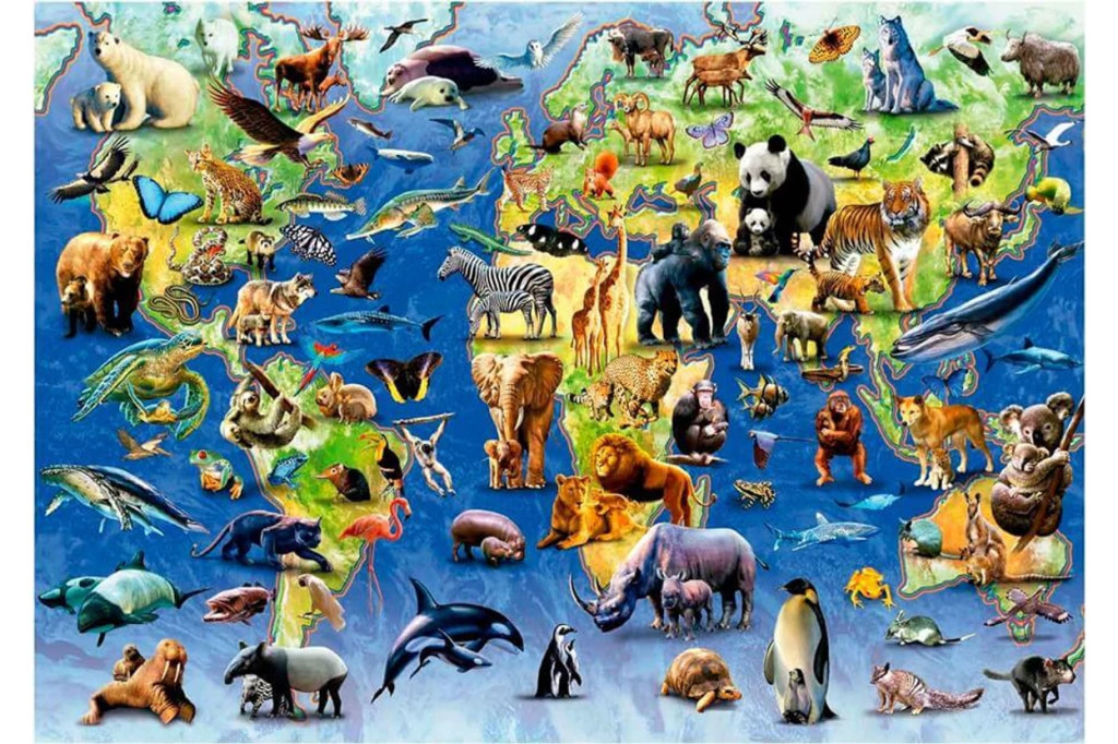 Ez az Educa 500 db-os puzzle - 100 veszélyeztetett faj kirakó képén egy térkép látható, mely megmutatja, hogy a világ egyes részein, milyen veszélyeztetett fajok találhatóak.